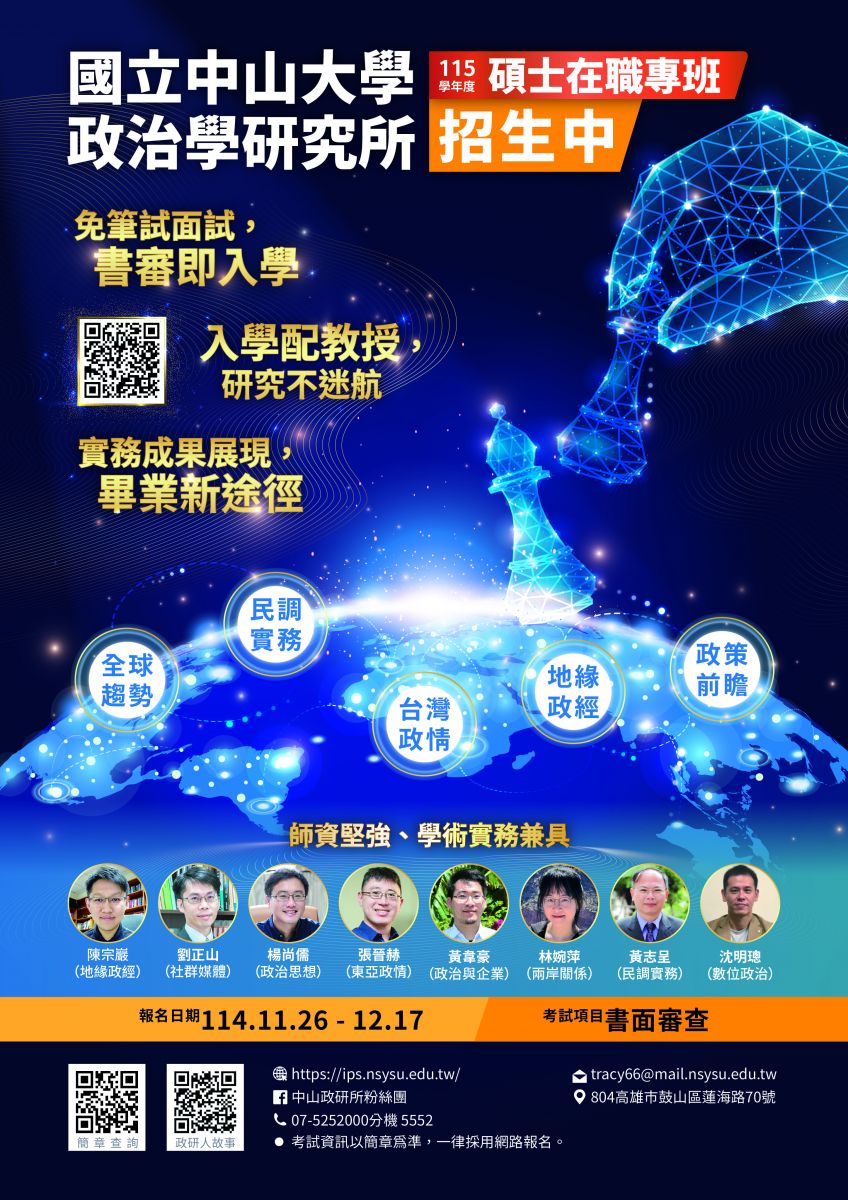 招生簡章:國立中山大學114學年度《碩士在職專班》招生簡章 (考試資訊以簡章為準)